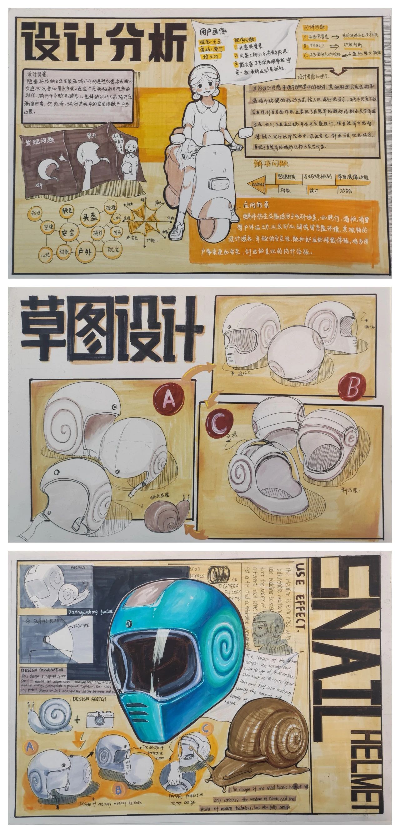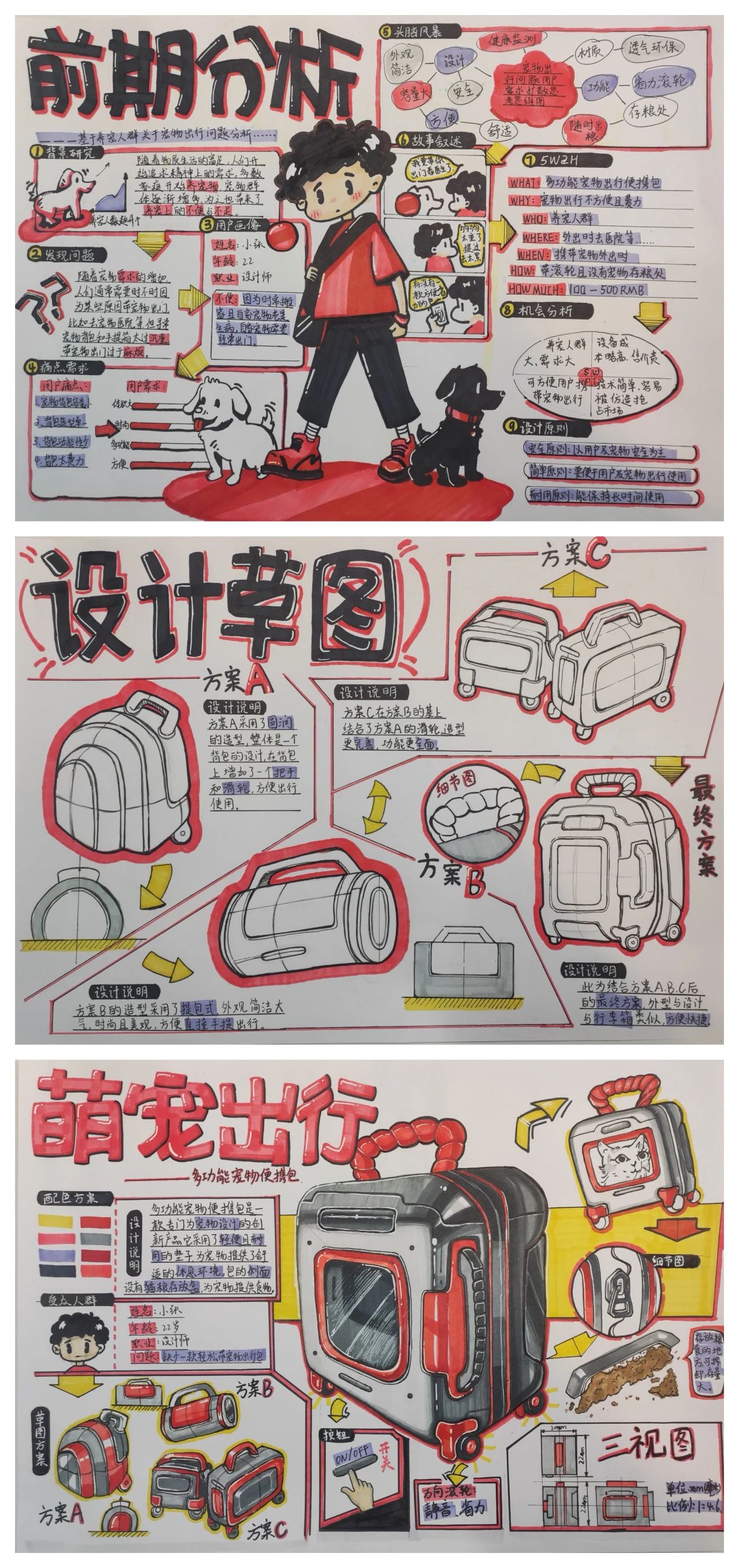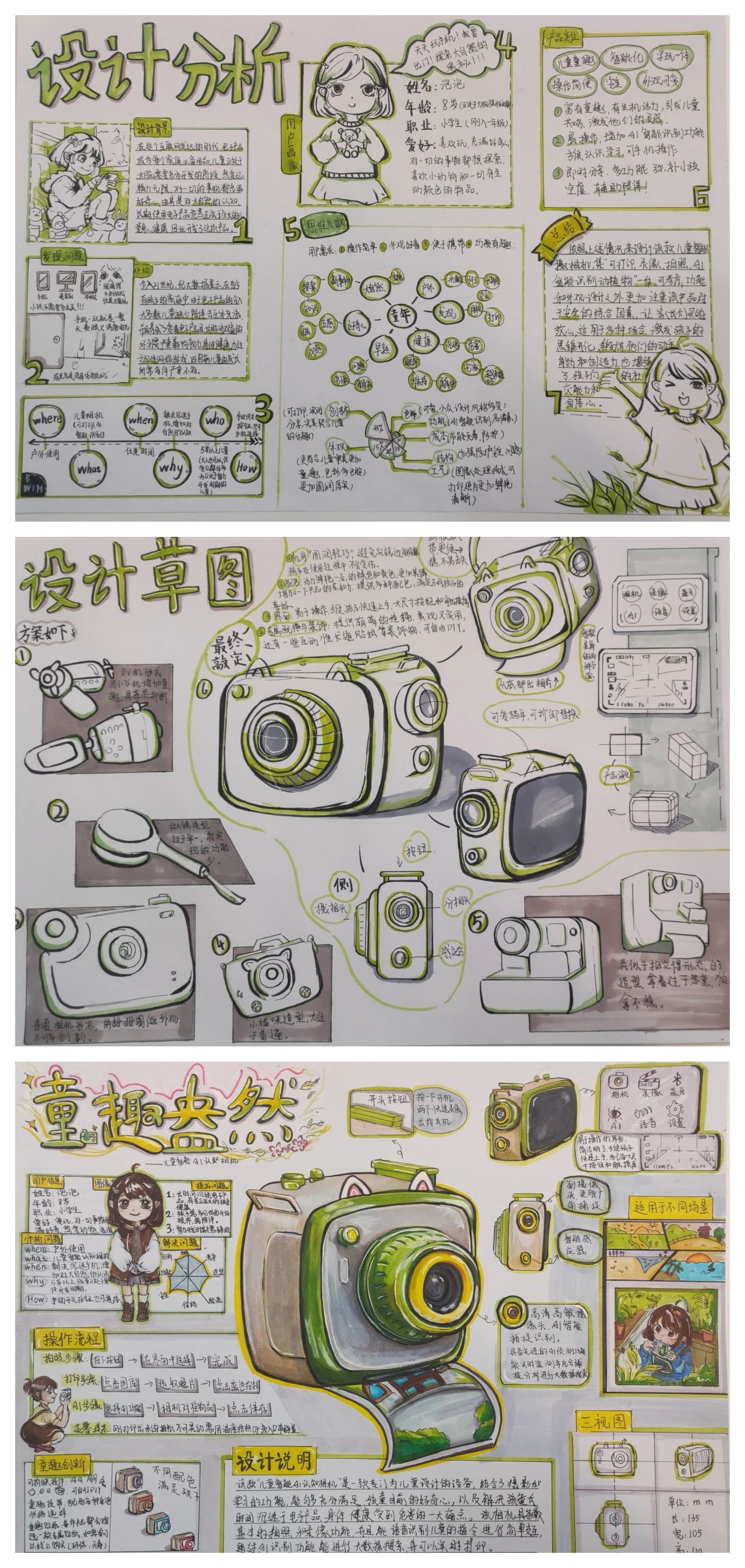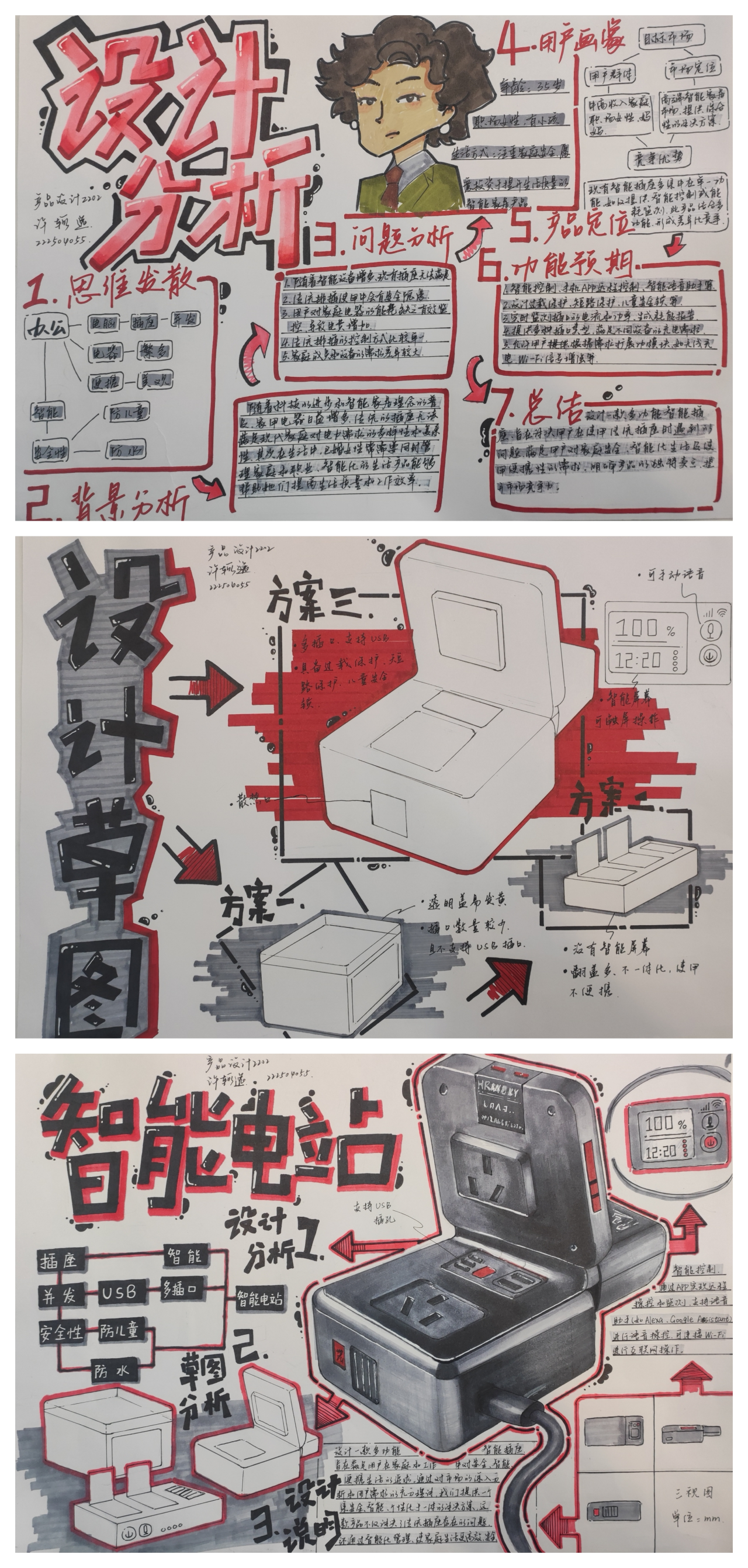 《产品快题设计》是产品设计专业的核心课程。学生根据教学要求注重创意与实践的结合。在设计过程中首先要明确主题,收集资料进行市场调研分析。然后通过草图快速展现创意构思,注重造型、功能及结构的创新。再进行深化设计,绘制主、辅效果图,强调细节表现,确保设计理念的准确传达。并结合使用情境,模拟产品与用户环境的交互,提升设计的实用性和用户体验。最后撰写设计说明,清晰阐述设计理念、差异化及用户体验,确保内容精炼、准确。整个教学过程强调逻辑性与艺术性并重,培养学生的综合设计能力。
