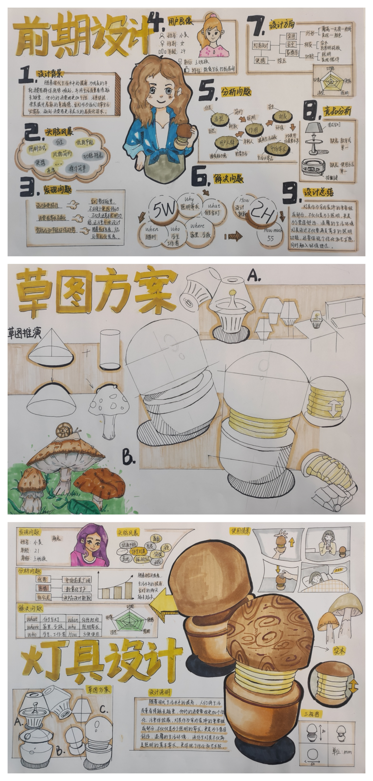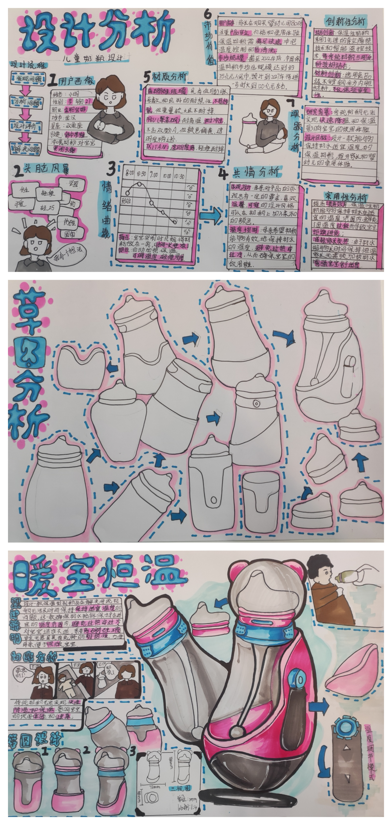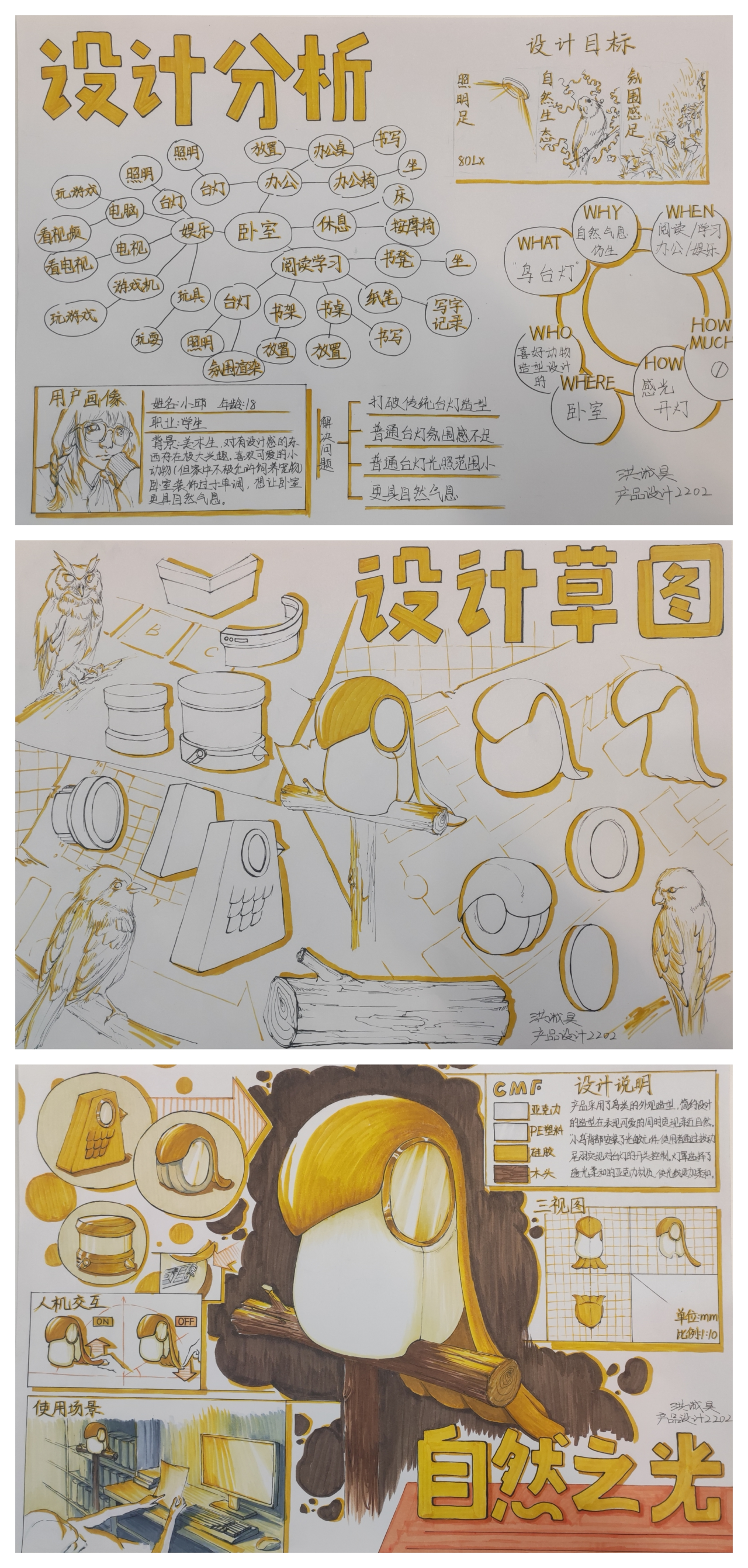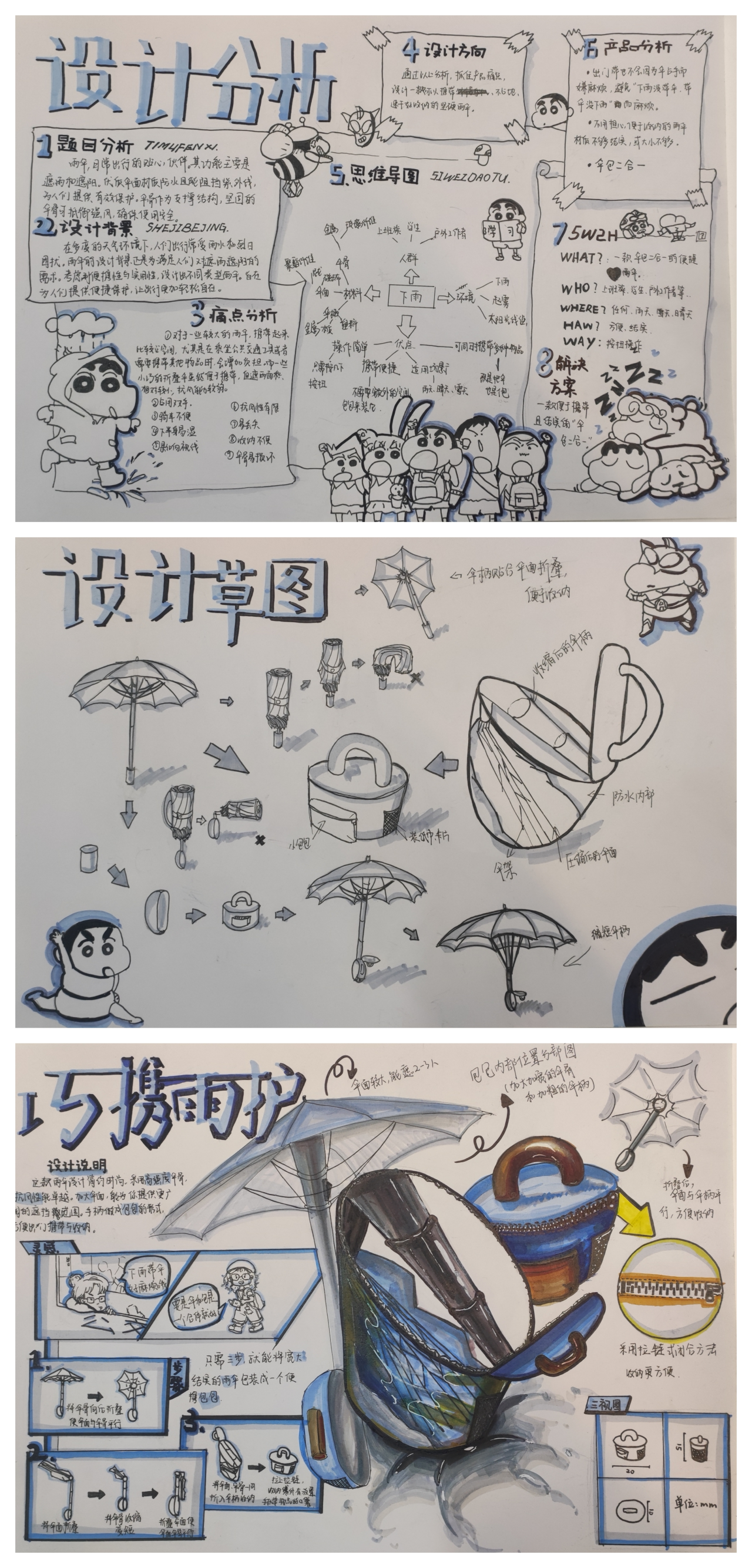 《产品快题设计》是产品设计专业的核心课程。学生根据教学要求注重创意与实践的结合。在设计过程中首先要明确主题,收集资料进行市场调研分析。然后通过草图快速展现创意构思,注重造型、功能及结构的创新。再进行深化设计,绘制主、辅效果图,强调细节表现,确保设计理念的准确传达。并结合使用情境,模拟产品与用户环境的交互,提升设计的实用性和用户体验。最后撰写设计说明,清晰阐述设计理念、差异化及用户体验,确保内容精炼、准确。整个教学过程强调逻辑性与艺术性并重,培养学生的综合设计能力。