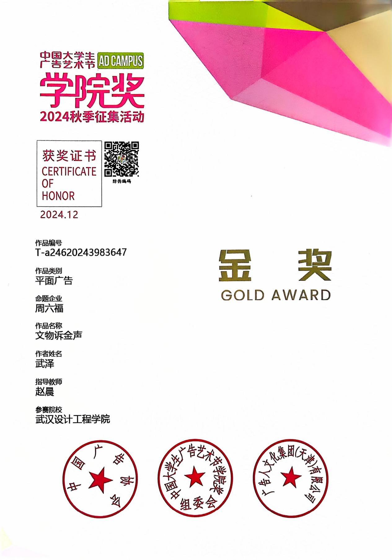 在刚刚结束的2024年学院奖秋季创意大赛中,我院广告学专业学生武泽在专业教师赵晨的指导下,历经多轮激烈竞争,脱颖而出,在中国大学生广告艺术节学院奖大赛中荣获了周六福年度创意金奖,并赢得了奖金3万元的全场大奖。