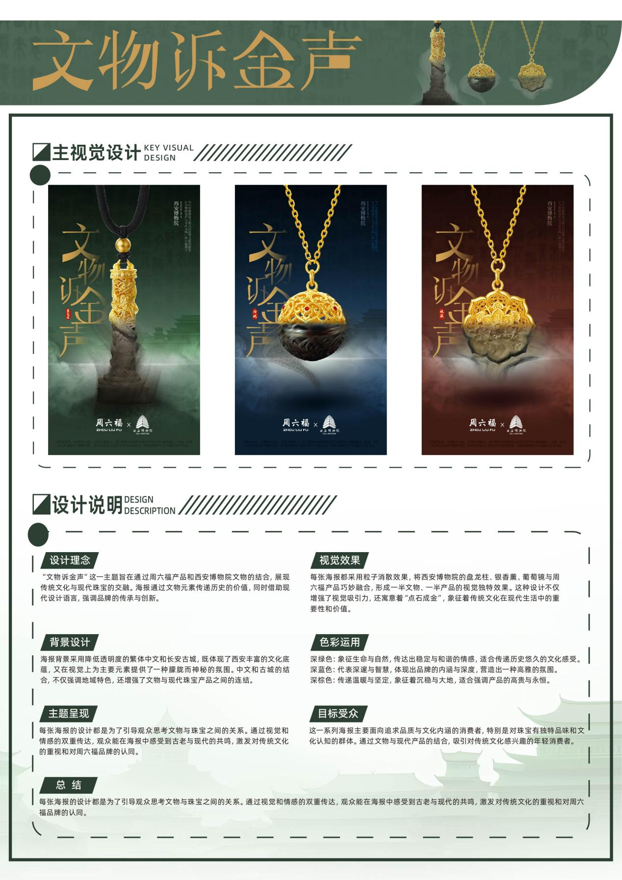 此次大赛中我院广告学专业学生武泽的获奖作品为周六福与西安博物院的联名合作项目,该作品以“文物诉金声”为主题,以仕女俑、鎏金走龙、金背瑞兽葡萄镜和唐三彩等西安博物院的重点馆藏文物为灵感,巧妙地将周六福产品与西安博物院的文物相结合,展现了传统文化与现代珠宝的完美交融。海报设计巧妙地运用了文物元素,传递出深厚的历史价值,同时融入现代设计语言,凸显了品牌的传承与创新精神。