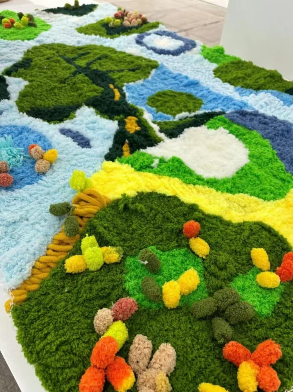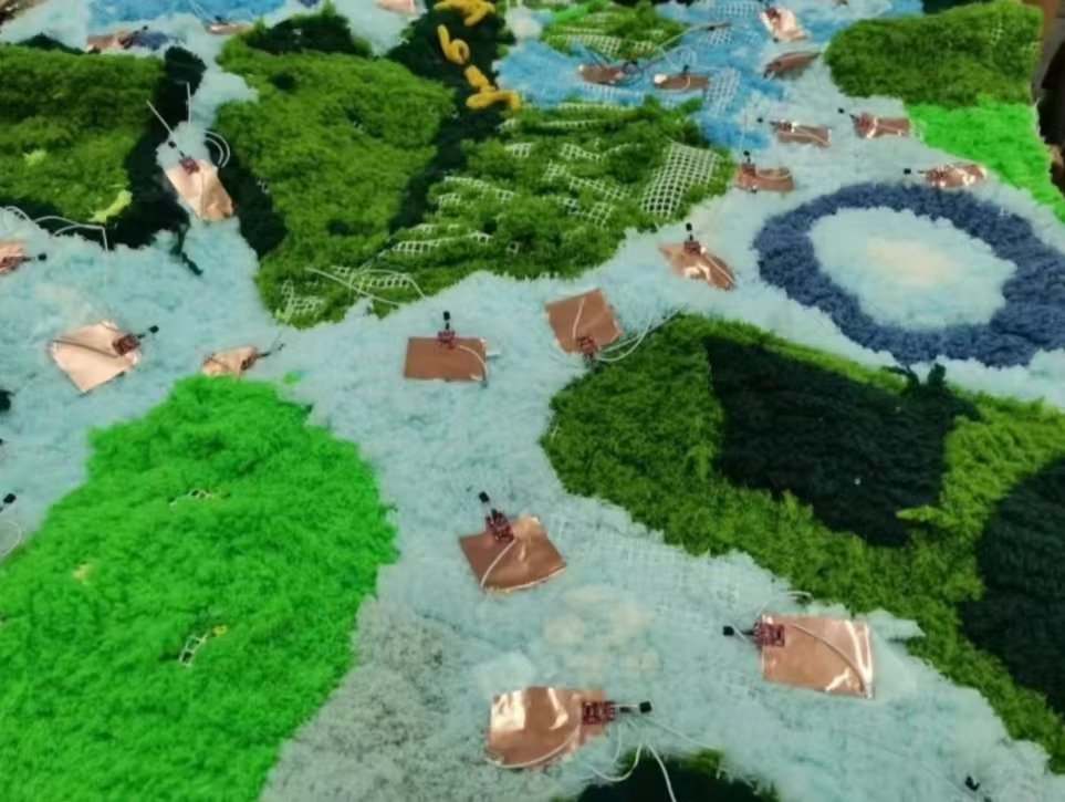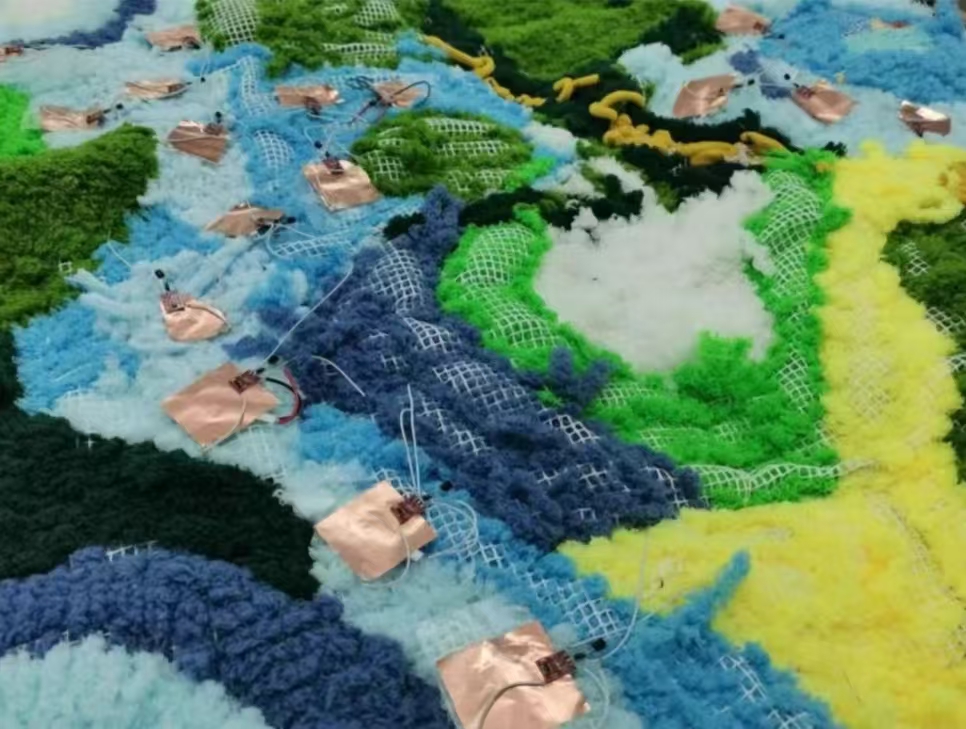 作品说明:触摸毛毯河流部分随之亮起,结束接触灯光熄灭。作品以河流草地为主题,画面主要表现为大地上的河流和自然景观。整体的颜色立体,中间的亮色代表河流散发出的波光粼粼。运用不同颜色的勾线手法进行编织使其融合产生渐变的效果。希望通过此作品能够展现自然独特的美感,探索大地的广袤。