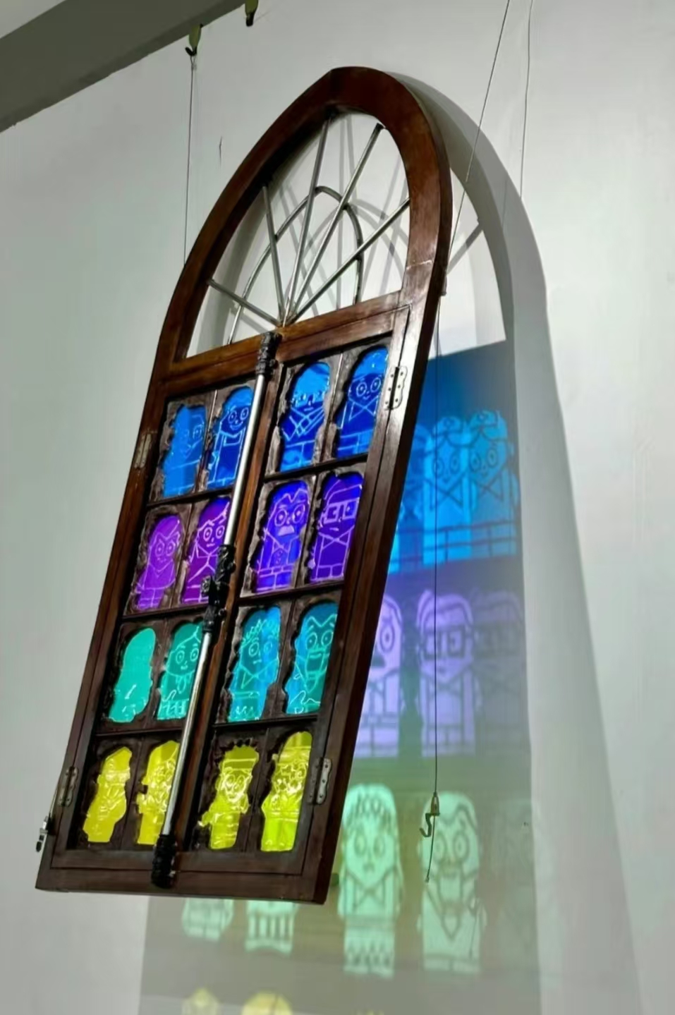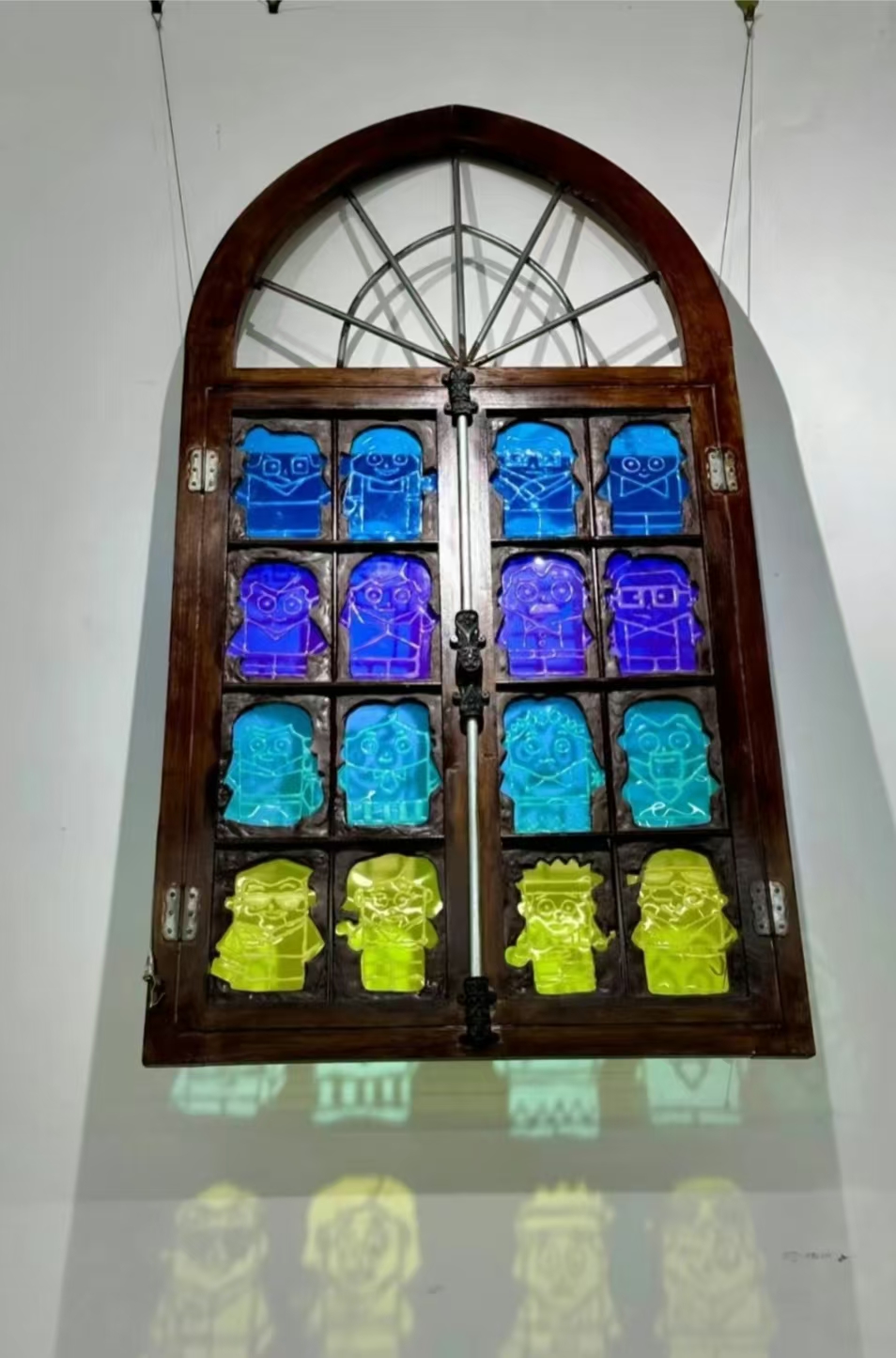 作品说明:本作品以旧窗为载体,将MBTI的16种人格与色彩、动漫形象融合。16个格子对应16种人格,用四种颜色区分,格子内有匹配的动漫人物。灯光赋予其生命,光影投在墙上,展现人格内涵与魅力。该作品融合多种元素,让观众在欣赏的同时理解MBTI人格,思考人性多元。