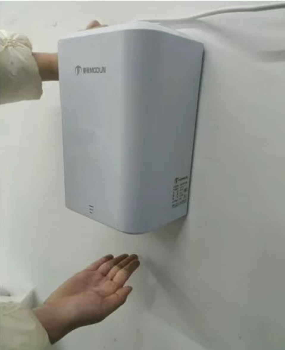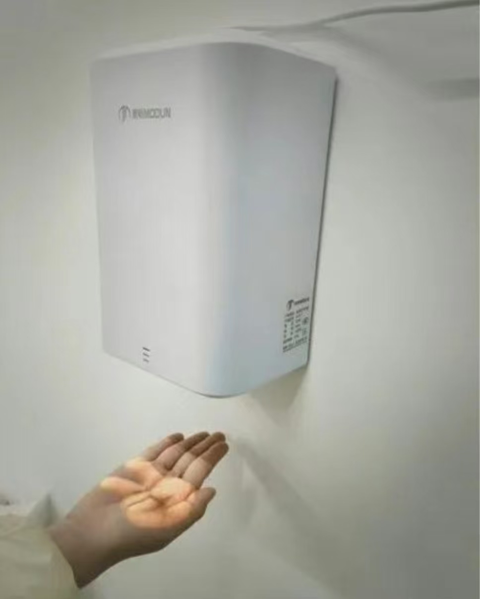 作品说明:此次装置艺术作品是以空间和观众的互动体验为主要表现形式的艺术类型。我们利用观众对于烘干机的刻板印象,让其认为会自动吹风出来,实则是使用烘干机的电路板链接电阻,并加上定制投影灯片等材料和物品来创造一个具有强烈视觉和感官效果的艺术环境。手伸向前就会自动感应到,然后投影到手心中一个剪刀手的图案,也寓意着不要忘记给生活比个耶!从当中让观众有更好的体验和感受。