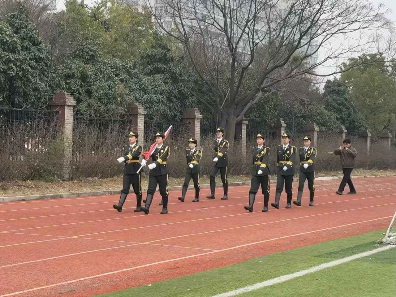 随着国歌的响起,升旗手有力地拉动绳索,鲜艳的五星红旗冉冉升起。旗手们身姿挺拔如松,手臂摆动有力,眼神中透露出对国旗的无上崇敬。他们一步步向前,护送着鲜艳的五星红旗稳步迈向旗杆。每一步都承载着责任与担当,每一步都踏出了青春向祖国致敬的坚定信念,身后留下的是同学们满是钦佩的目光。国旗升至杆顶,迎风飘扬。