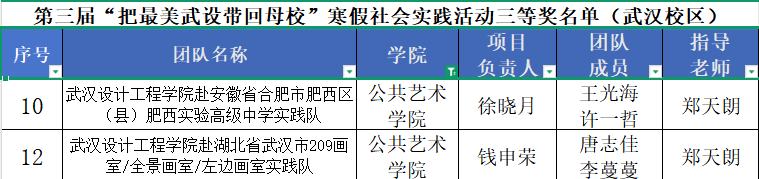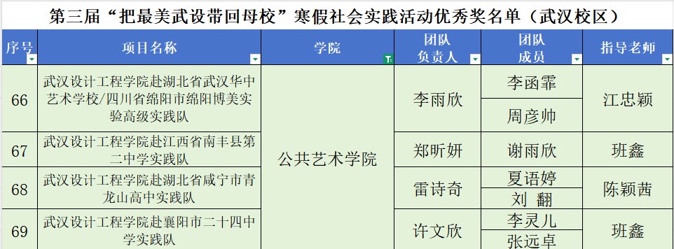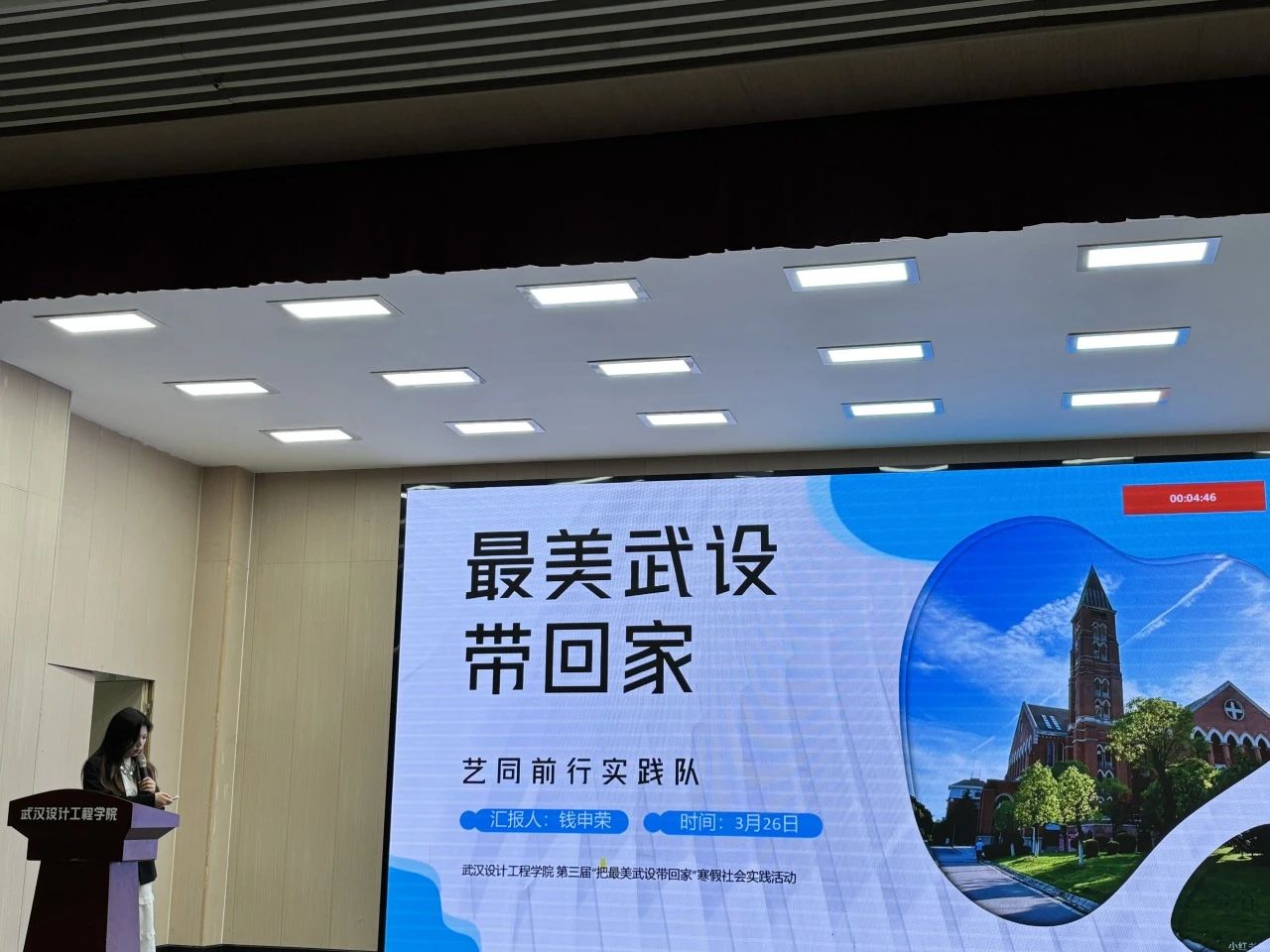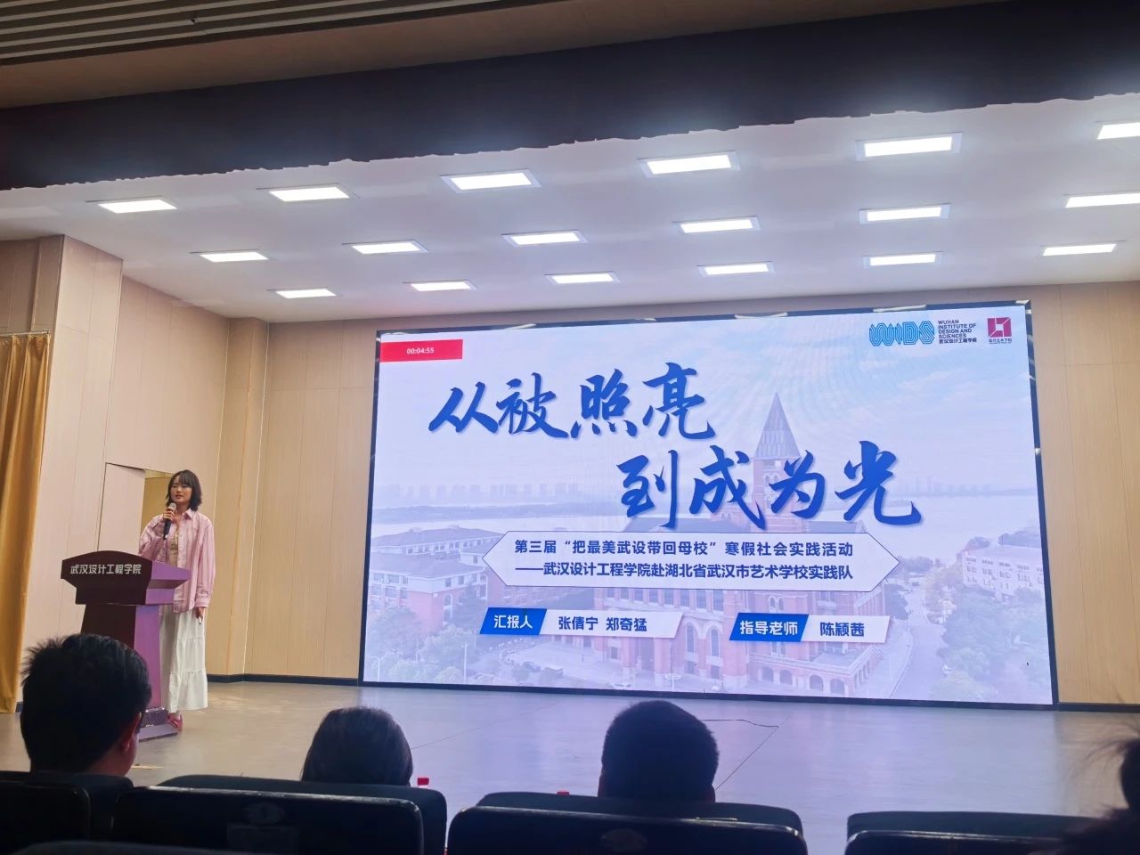 赴湖北省武汉市艺术学校实践队:团队共5名成员,来自4个专业,包括公共艺术、视觉传达设计、展示艺术设计、环境设计。于2025年1月赴湖北省武汉市艺术学校,通过宣讲ppt、播放宣传片、搭建艺术交流圈等形式,在高二高三两个年级中顺利开展了实践活动。