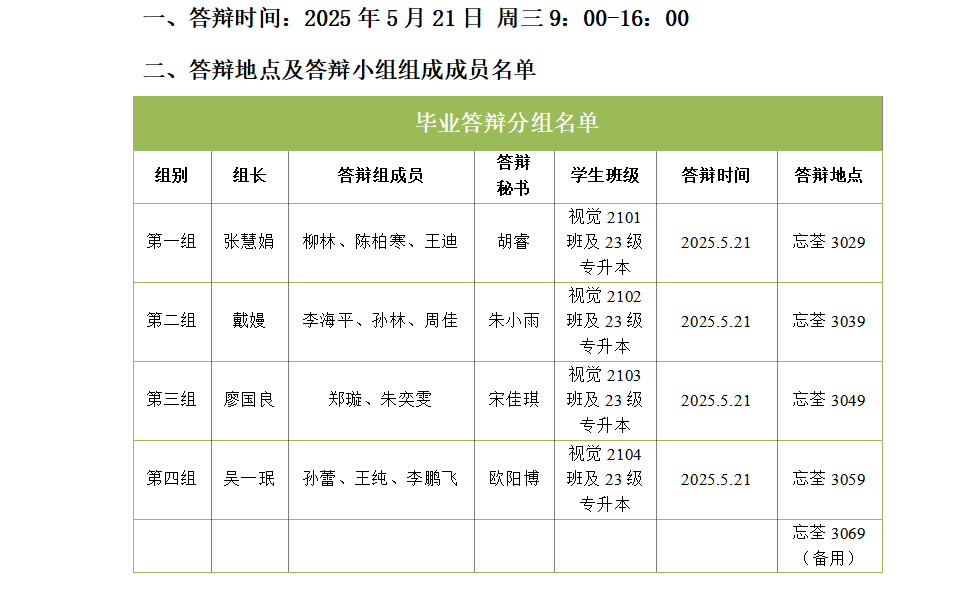 结合教务处相关文件要求,对系部毕业答辩工作进行全面部署。为提高工作效率,确保工作质量,将我系答辩老师分为4个小组,由张慧娟、戴嫚、廖国良、吴一珉分别担任组长,对毕业学生开展毕业答辩工作。
