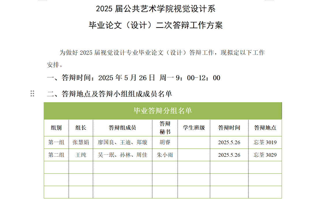 2025年5月26日(周三)上午9:00在忘荃3019、3029,视觉设计系对未通过第一次答辩的29名毕业生进行了二次答辩。二次答辩主要针对初次答辩中未达标或需改进的毕业论文(设计)进行再次审核,旨在确保学生的毕业论文(设计)达到毕业要求。