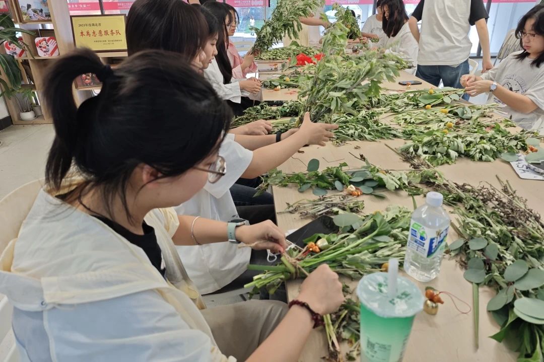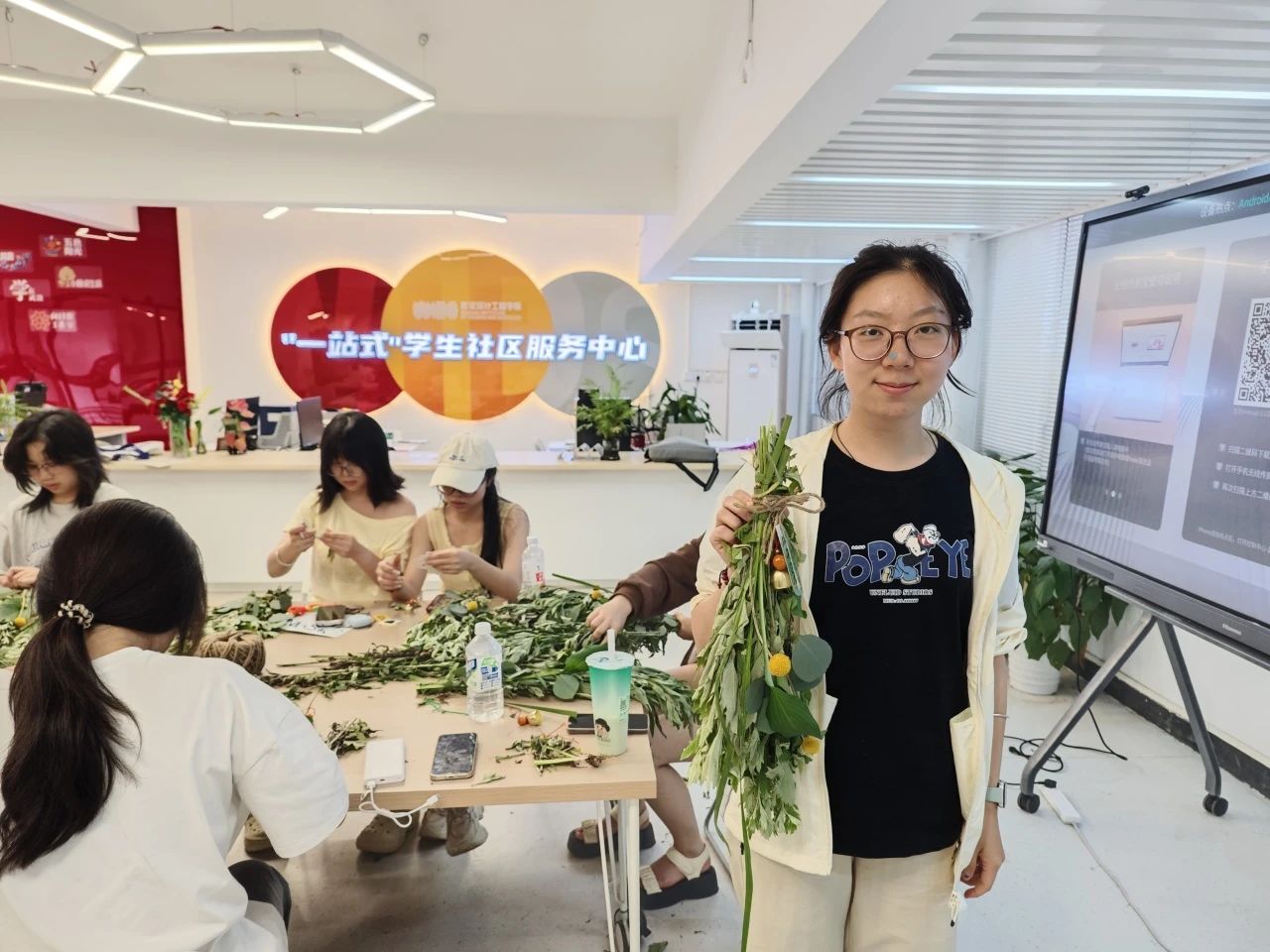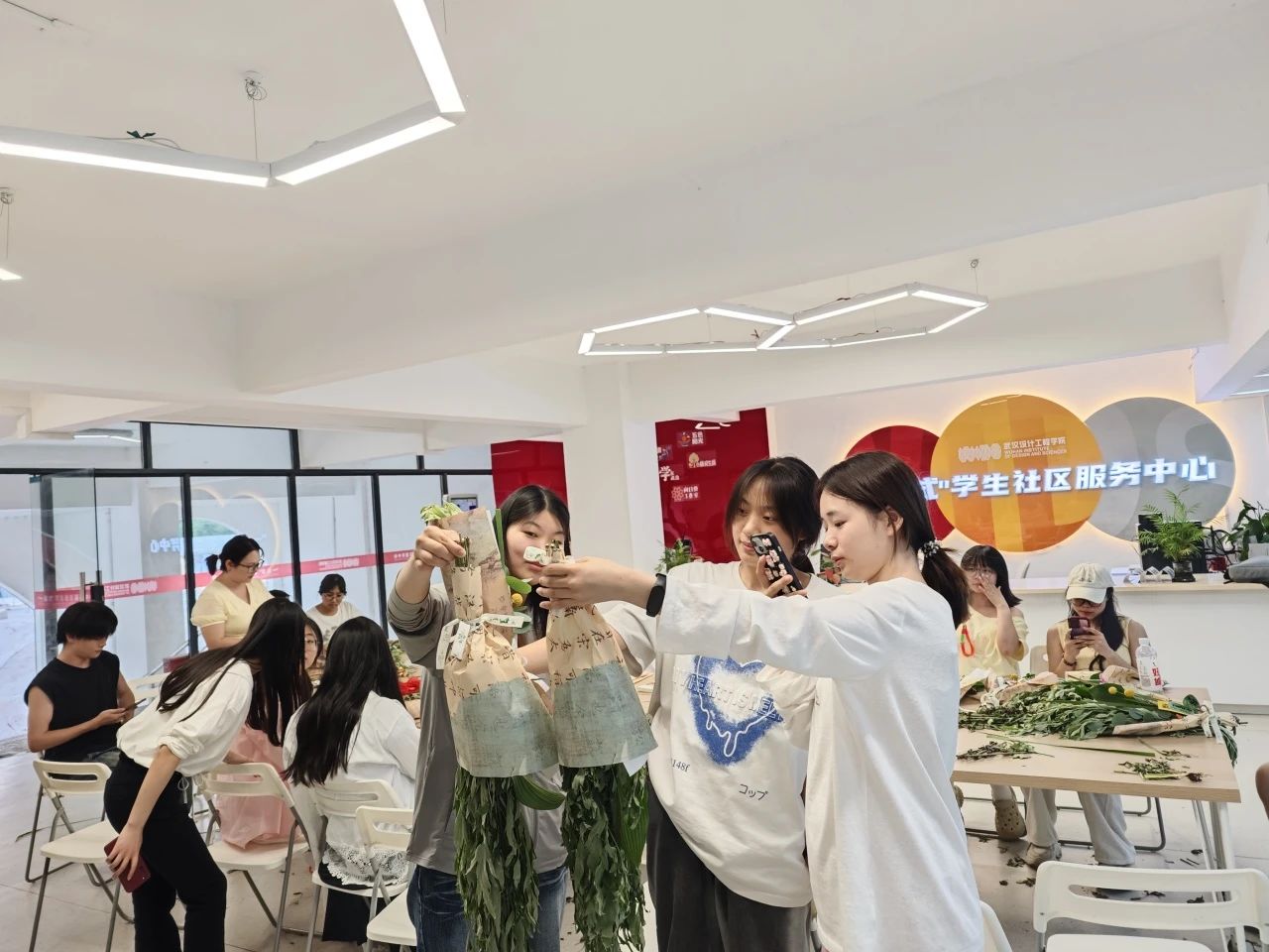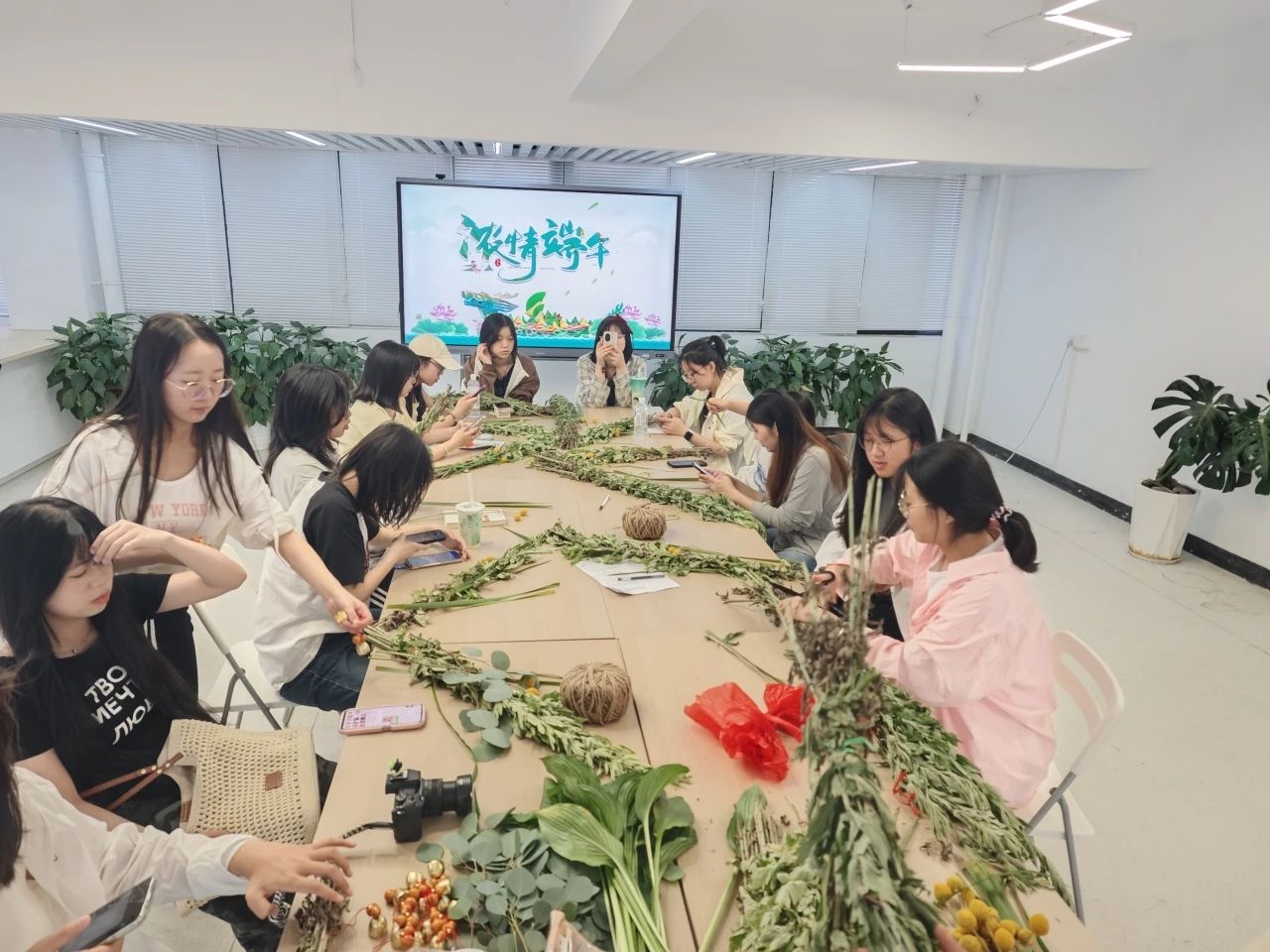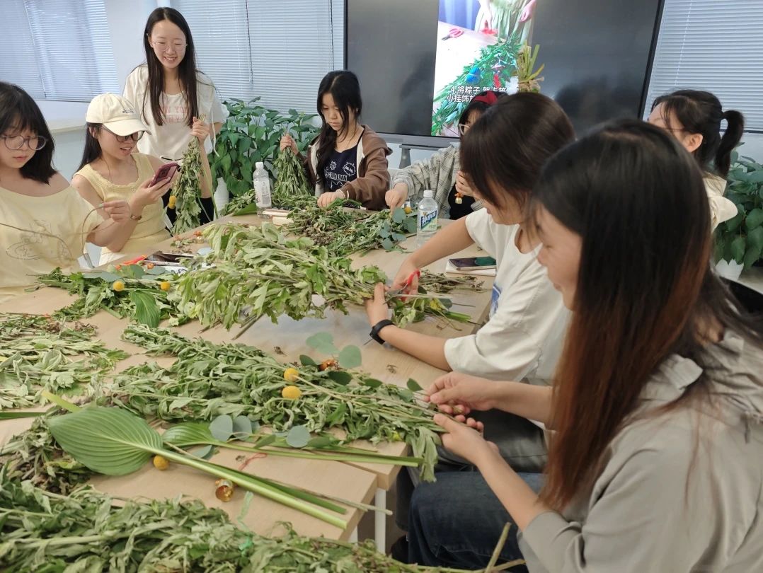 活动于17:40准时开始,同学们在专业老师的指导下,使用新鲜的艾草和其他辅助材料,亲手制作了具有驱虫避疫、祈福安康寓意的艾草门挂。在制作过程中,同学们不仅学习到了端午节挂艾草的传统习俗,还通过亲手制作,更加深刻地体会到了传统文化的内涵和价值。