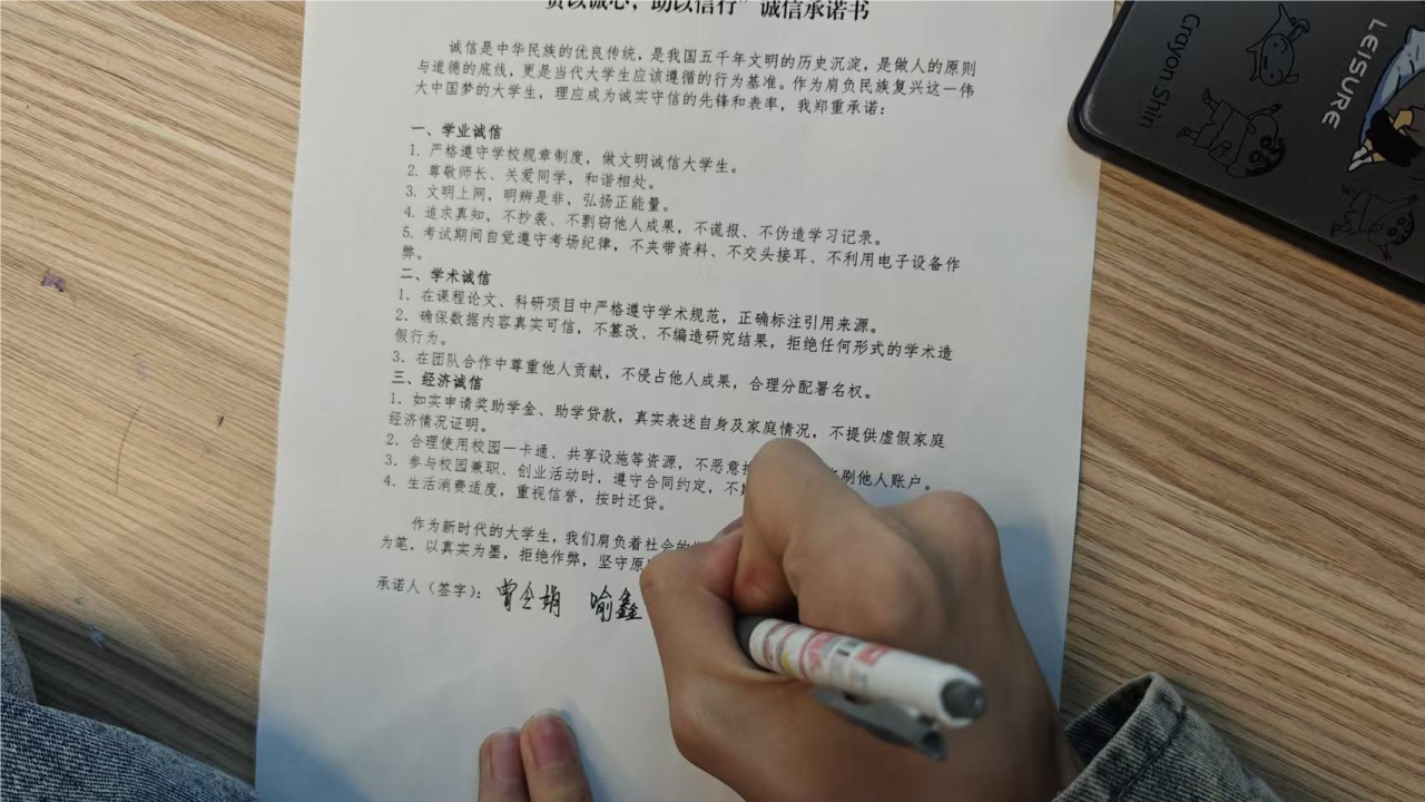 全体学生签署《“资以诚心,助以信行”诚信承诺书》,非毕业年级承诺书包含学业学术诚信、经济诚信,毕业年级承诺书则新增就业诚信方面。借此强化大学生的诚信意识,引导他们深入理解和体验诚信的内涵,树立正确的价值观。