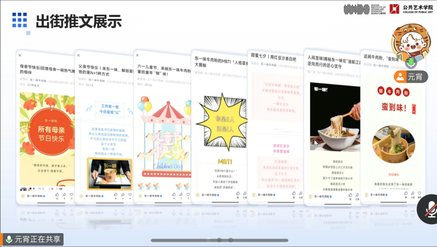 此次合作聚焦于为东一味官方公众号量身打造推文内容,旨在精准传递品牌理念,有效提升品牌的市场认知度与影响力。合作期间,为进一步激发学生的创作热情与实践能力,企业特别设立总额为2000元实践基金,对表现优异的学生给予奖励,鼓励大家在实战中锤炼技能、突破创新,创作出更具市场价值的优秀作品。最终这些富有创意的推文作品,赢得了企业的认可,在企业公众号上陆续发布。
