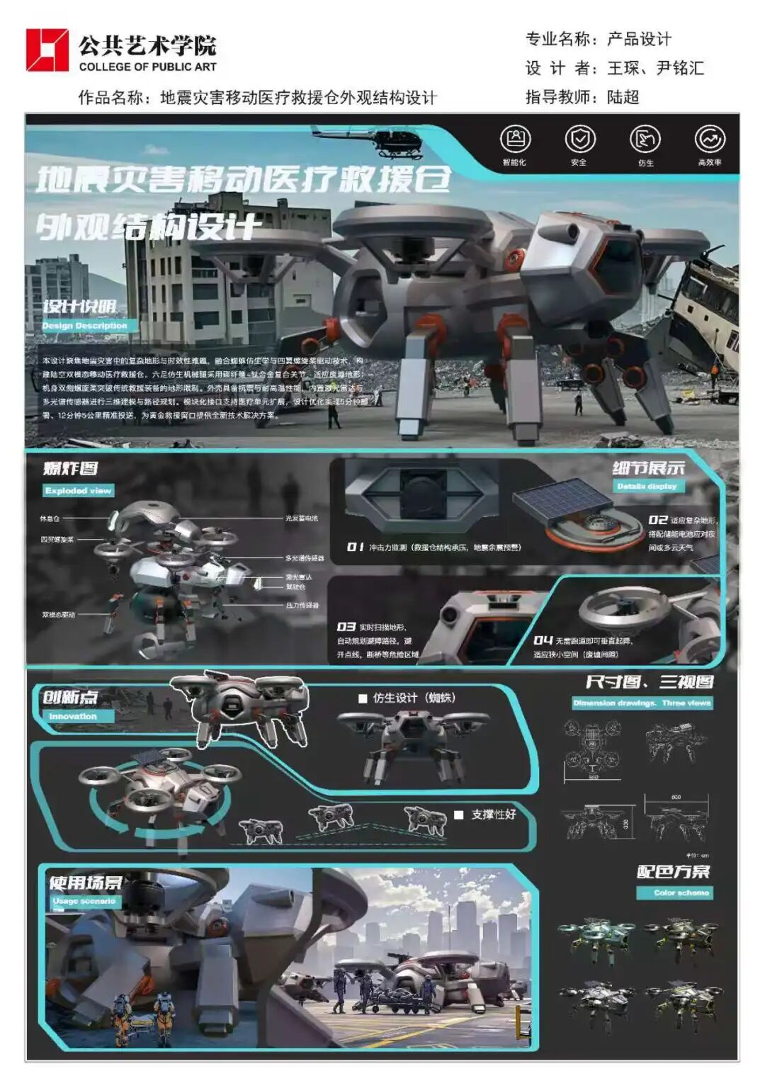 本设计为陆空两栖地震救援舱:蜘蛛仿生六足+四旋翼结构,碳纤维-钛合金关节突破地形限制,集成多传感器实时建模,模块化医疗舱实现5分钟部署/12分钟5公里精准投送,为黄金救援期提供高效技术支撑。