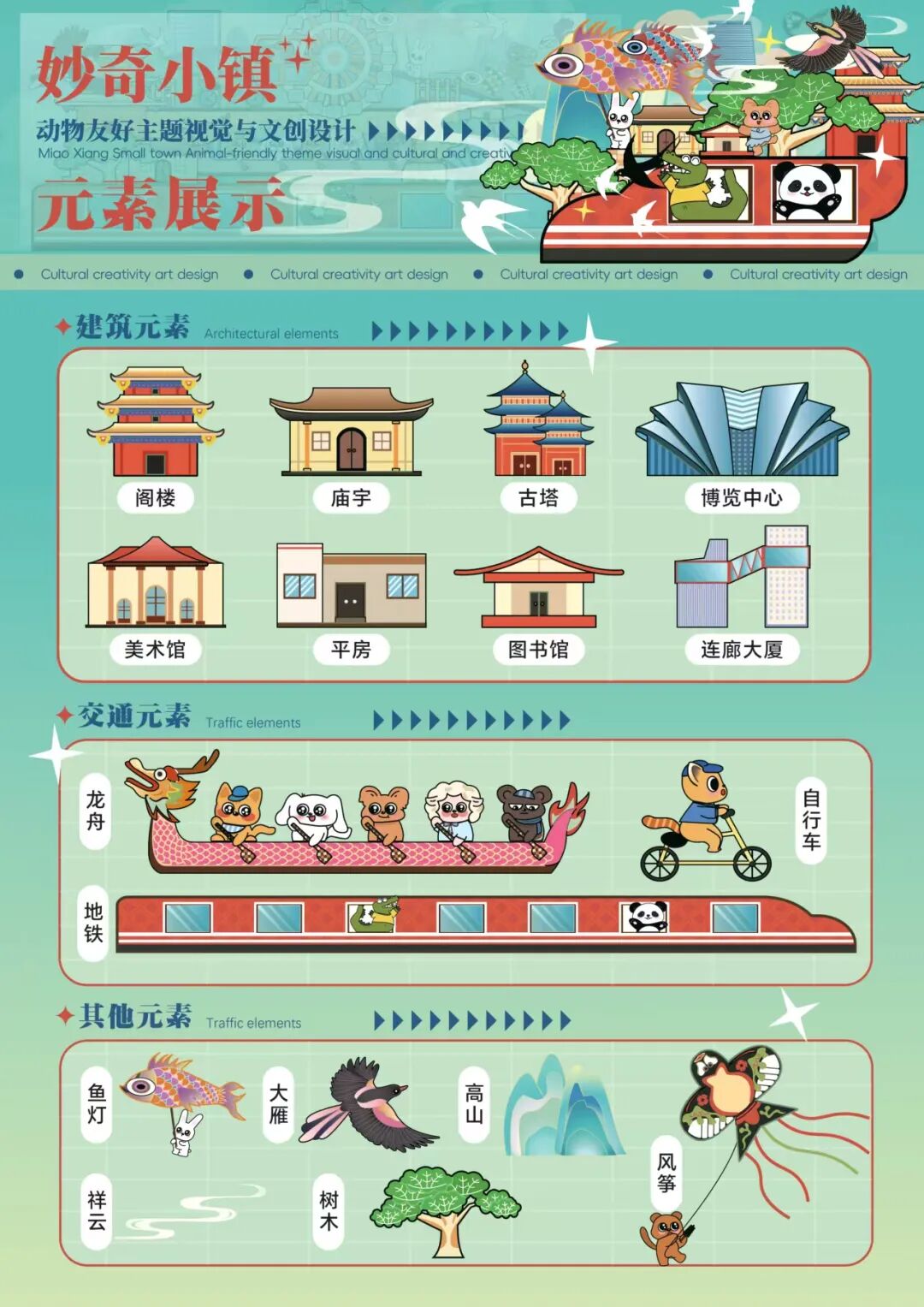 “妙想小镇”动物主题文创设计,以活泼可爱的动物形象为主角,构建了一个充满欢乐与惊喜的小镇世界。设计中融入了中国风元素,如传统建筑、风筝、鱼灯等元素,展现了浓厚的文化底蕴。动物们在小镇中自由生活,有的在屋顶上玩耍,有的在街道上漫步,营造出一种和谐美好的氛围。通过这些生动的动物形象和场景,我们传递出动物友好的理念,同时激发人们对传统文化的兴趣和热爱。