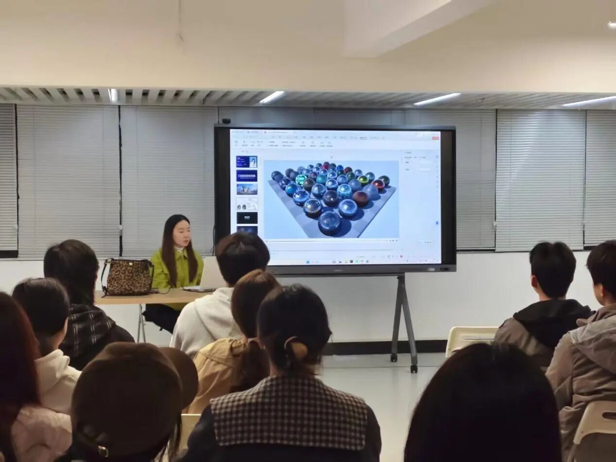 讲座伊始,童老师并未直接切入技术细节,而是以一段《无限暖暖》的游戏实机演示片段暖场。视频中,角色服装的面料质感、光影变化下的皮肤细节以及与场景互动时的物理反馈,都做得极为逼真。“大家可以猜猜,这段视频背后至少涉及了哪几个设计岗位?”她笑着抛出问题,瞬间点燃了现场气氛。同学们踊跃发言,从“角色建模师”到“材质艺术家”,答案五花八门,童老师一一点评,并顺势引出本次讲座的核心:“三维技术早已不是简单的‘画个立体图’,而是一套能让创意‘活’起来的完整体系。”