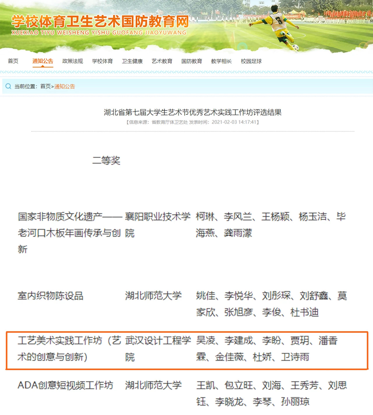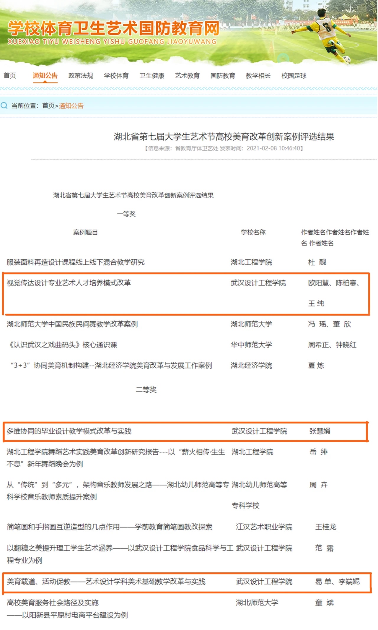 本网讯(记者张慧娟、余青莲)近日,湖北省第七届大学生艺术节评选结果揭晓,我院报送的《工艺美术实践工作坊(艺术的创意与创新)》获优秀艺术实践工作坊二等奖;《视觉传达设计专业艺术人才培养模式改革》获高校美育改革创新案例一等奖,《多维协同的毕业设计教学模式改革与实践》、《美育载道、活动促教——艺术设计学科美术基础教学改革与实践》获二等奖。