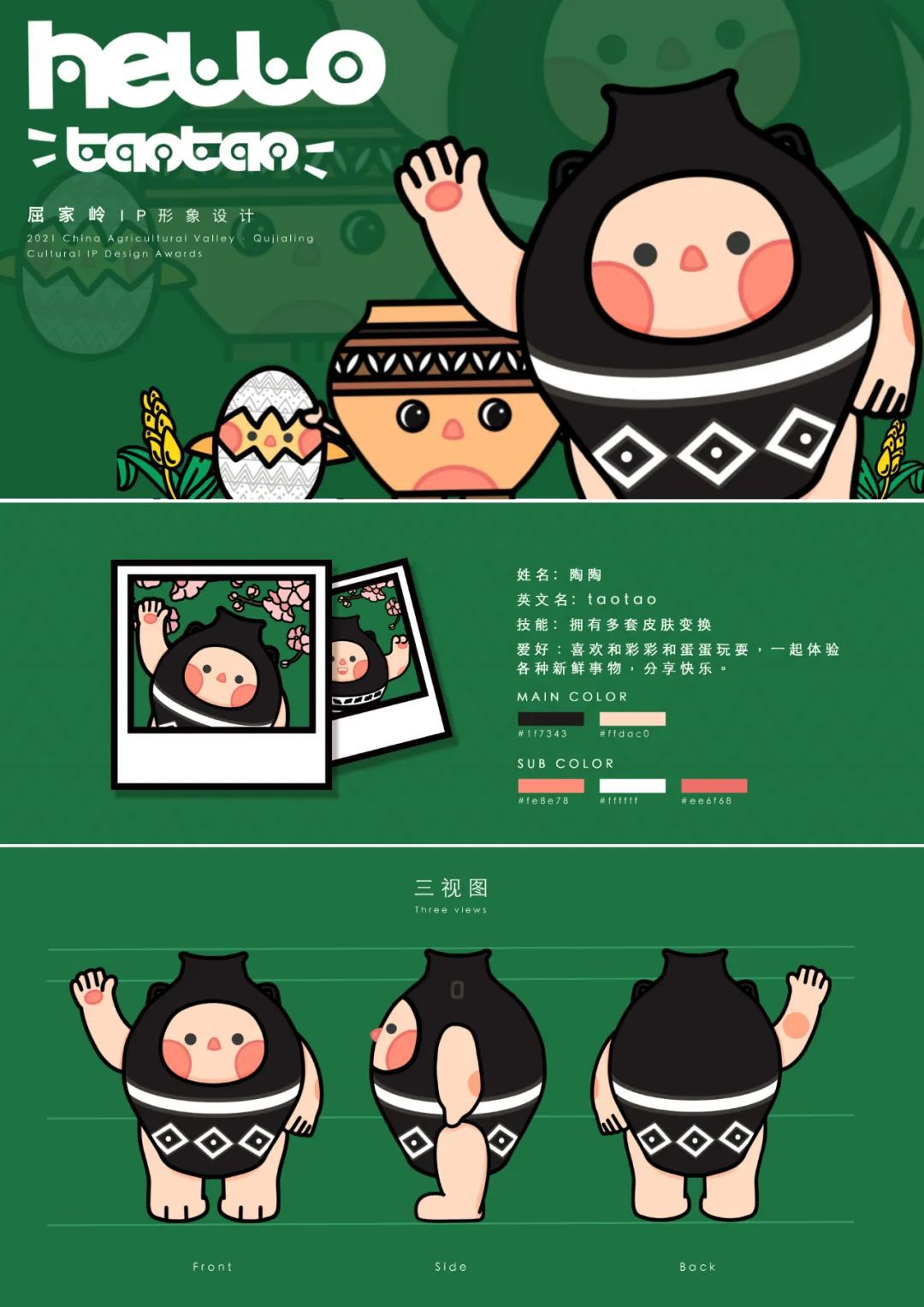 梁晨同学的作品 “HELLO TAOTAO”,创作灵感来源于屈家岭的“TAO”文化,寓意屈家岭漫山遍野美丽的桃花、历史悠久极具特色的黑陶与欢迎四方来客到屈家岭淘宝。“TAO TAO”身上多变的图案,来自屈家岭黑陶典型的特征纹样,举手的身姿是对每个来客的热情呼唤。该作品将五千年的农耕文化用设计创意表达,展现新生代对文化的传承理解,激发更多青年群体对文化的关注。
